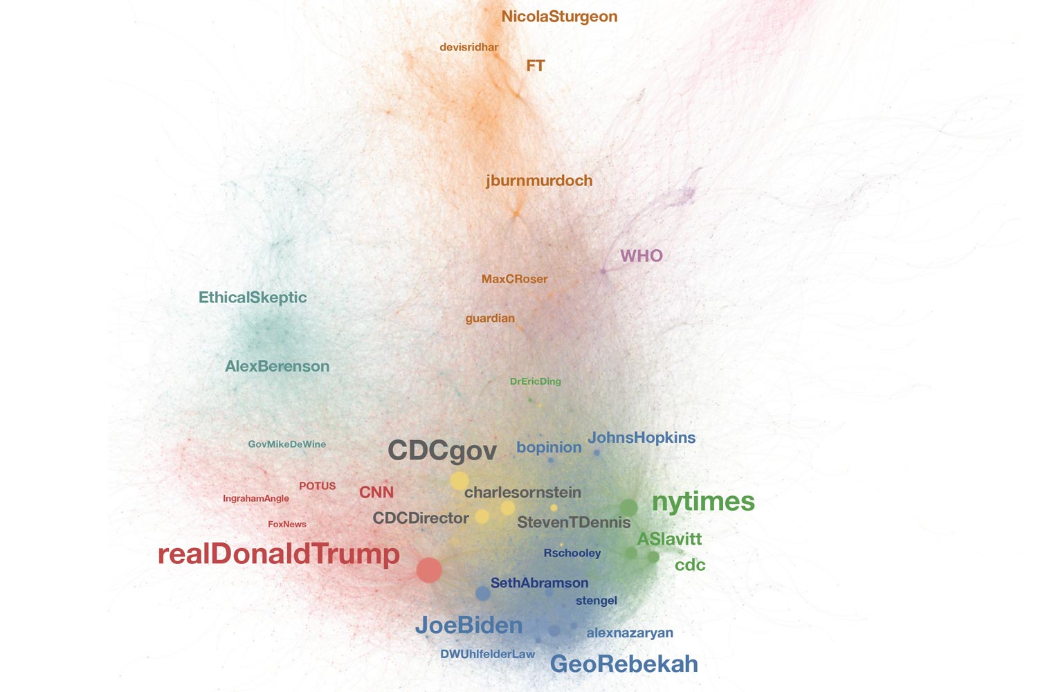 他们在Twitter上使用他们的计算方法收集了近50万条提到“COVID-19”和 “数据(data)”的推文。通过这些推文,研究人员生成了一个网络图以找出“谁在转发谁,谁喜欢谁”。Lee表示:“我们基本上创建了一个相互交流的社区网络。”群组包括“美国媒体社区”或“反口罩者”等群体。研究人员发现,反口罩者群体在创建和分享数据可视化方面跟其他群体一样多,甚至比他们更多。