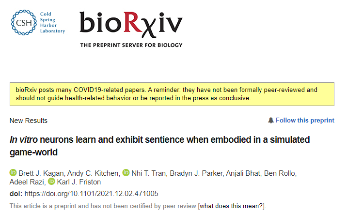 本月初,来自澳大利亚脑科学公司 Cortical Labs,以及澳、英、加等国多所知名学府的研究人员,在生物学论文预印本网站 bioRxiv 上发表了《体外神经元在模拟游戏世界中学习并表现出知觉性》一文,首次展示了该团队在脑科学方面前所未有的最新进展: