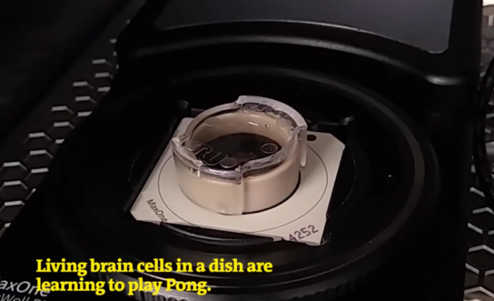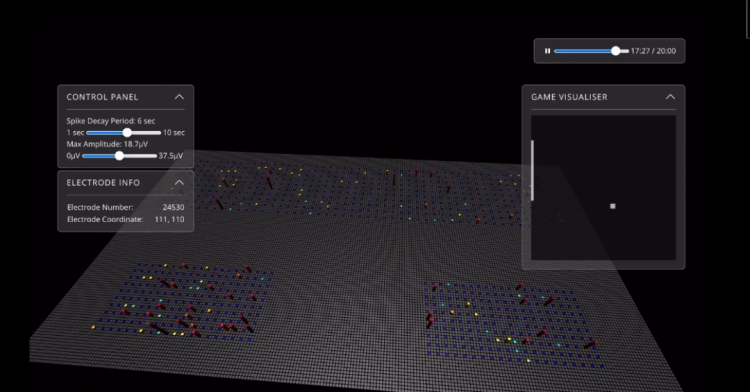 这些活体脑细胞,来自人类和啮齿动物源,在培养皿中和硅基电路板通过高密度微电极阵列实现了结合。电路传输微弱的信号,对细胞产生刺激效果,使得它们以为自己是《Pong》游戏里的球拍。
