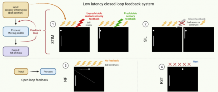 DishBrain 是一个在结构化环境中,利用脑细胞神经元固有的适应性计算能力,从而展示自然智能的系统……培养物被嵌入到一个模拟的街机游戏“Pong”的世界中……在此系统上,我们对此前无法实测的“主动推理”理论实现了实测,并且发现实际游戏时间5分钟以内就可以观察到培养物具有学习能力……