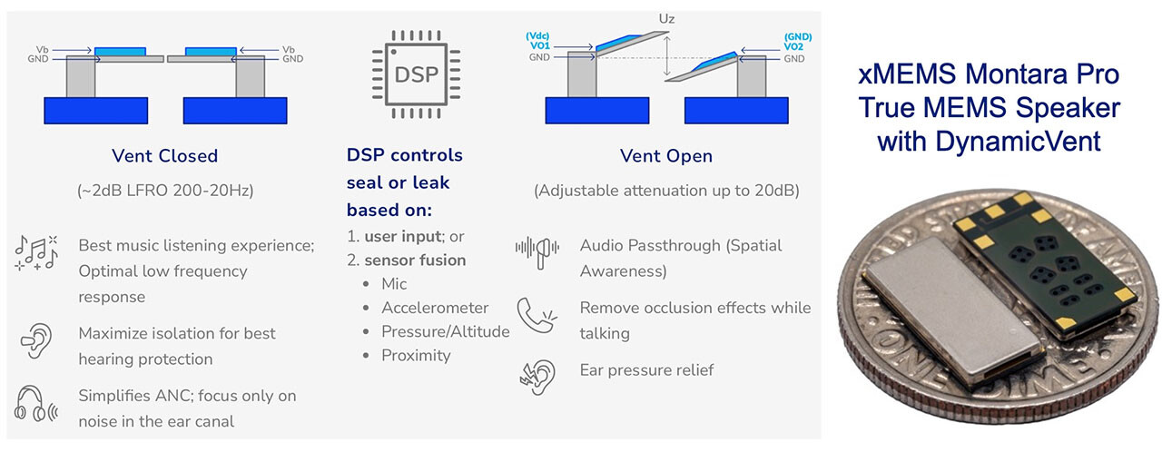 xMEMS实验室今天推出了Montara Pro,这是世界上第一款集成了DynamicVent的单片MEMS微扬声器,结合了闭合式和开放式耳塞的优点,可用于智能TWS耳塞和助听器,创造出两全其美的用户体验。