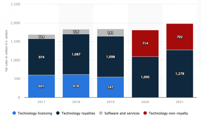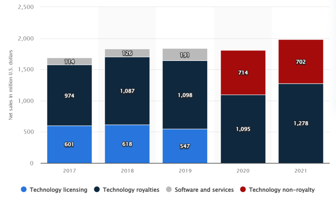 ▲ Arm 2017 财年-2021 财年营收与各部门收入情况(来源:Statista)