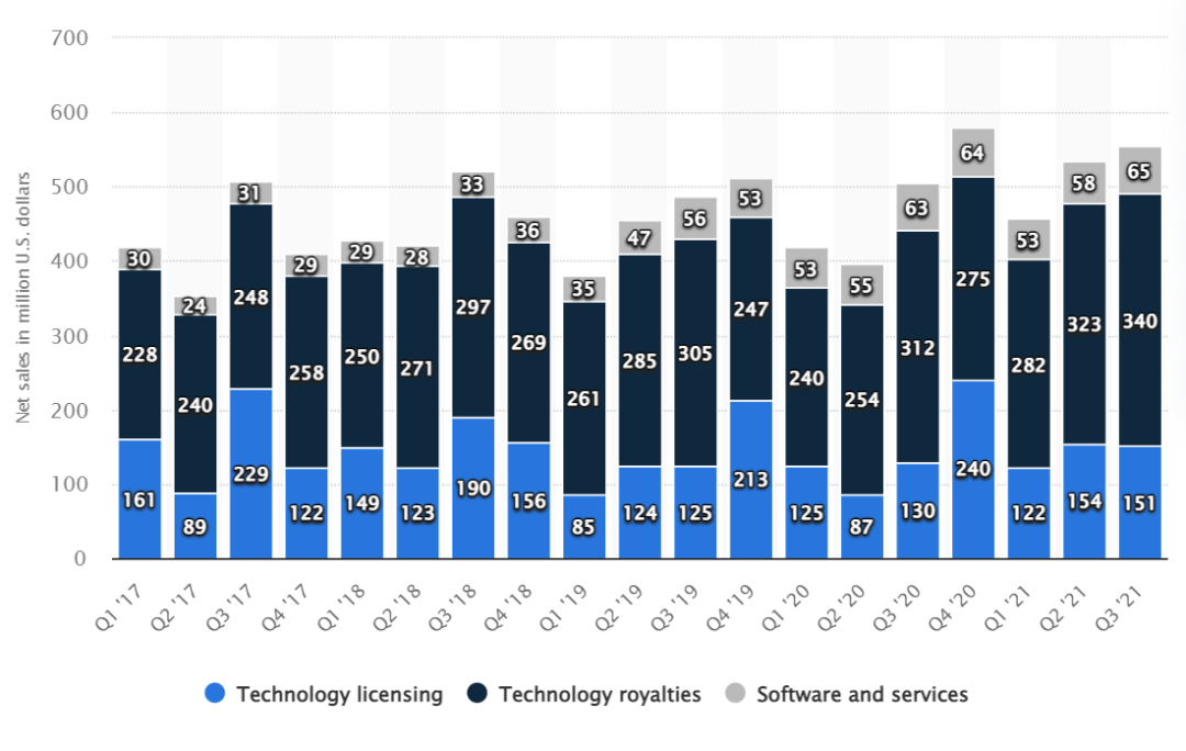 ▲ Arm 2017 年 Q1-2021 年 Q3 各季度营收情况(来源:Statista)