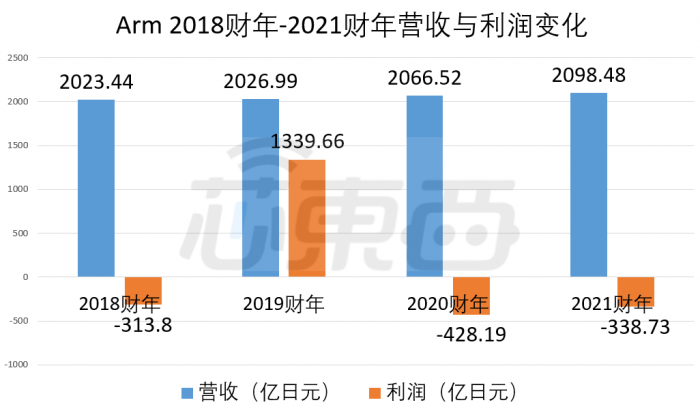 问题更加严重的则是 Arm 的盈利能力,根据软银财报,Arm 从 2018 财年到 2021 财年,只有 2019 财年盈利 1339.66 亿日元(约合 73.67 亿人民币),2018 财年、2020 财年和 2021 财年,Arm 分别亏损 313.80 亿日元(约合 17.25 亿人民币)、428.19 亿日元(约合 23.54 亿人民币)和 338.73 亿日元(约合 18.62 亿人民币)。
