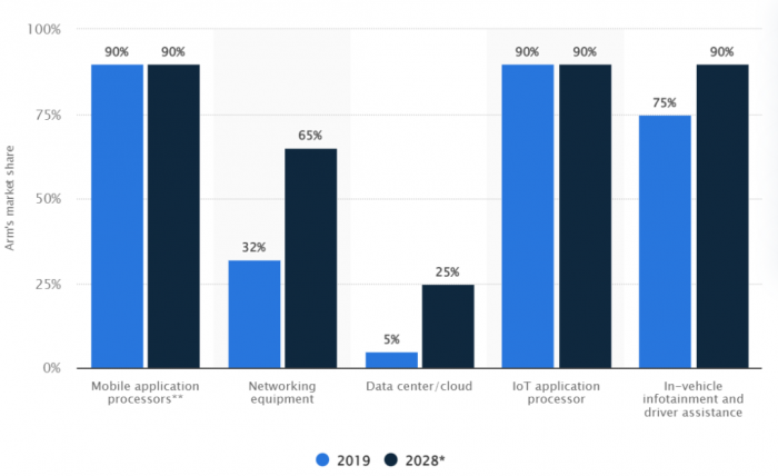▲ Arm 2019 年各个市场的份额和其 2028 年预计获得的市场份额(来源:Statista)