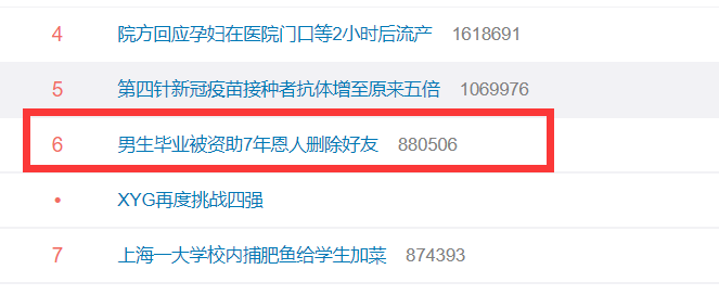 今日,一则男生毕业被资助7年恩人删除好友的消息登上微博热搜。近日,西南民族大学学生谢洋想寻找一名资助自己上学多年的杭州飞行员“冰哥”。1月1日,在转给谢洋6000元助学金后,“冰哥”删除了其微信,并表示:我的任务完成了,我资助你上学并不求回报。