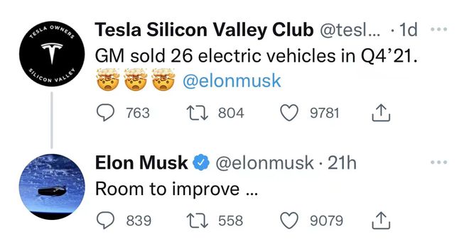 1月6日消息,此前通用汽车在美国市场的交付数据显示,通用汽车去年第四季度共售出26辆电动汽车。当地时间周二电动汽车制造商特斯拉首席执行官埃隆·马斯克(Elon Musk)在个人社交媒体上表示,“(通用汽车)有提升的空间。”
