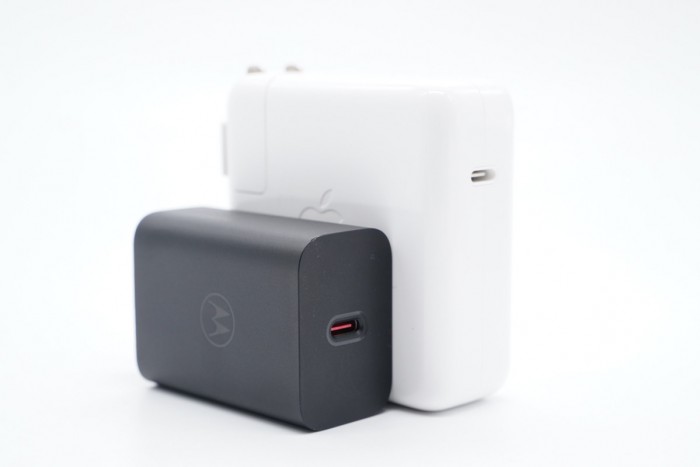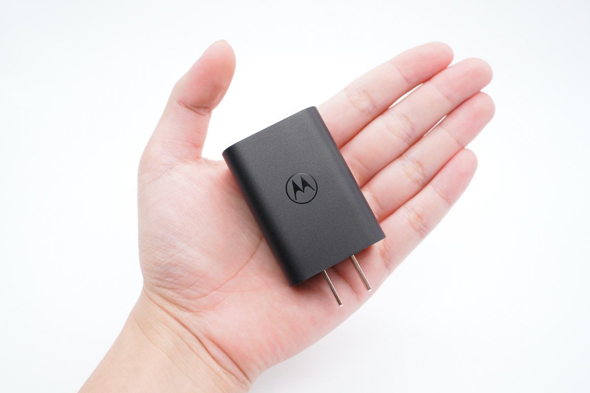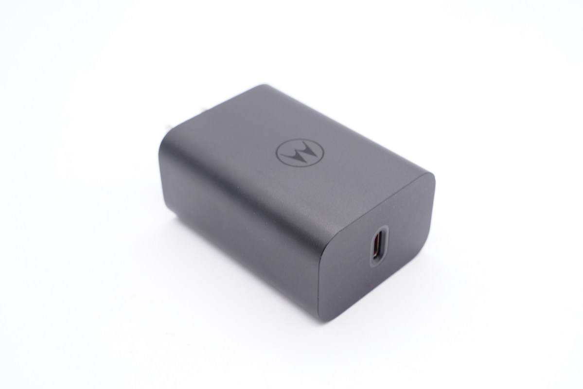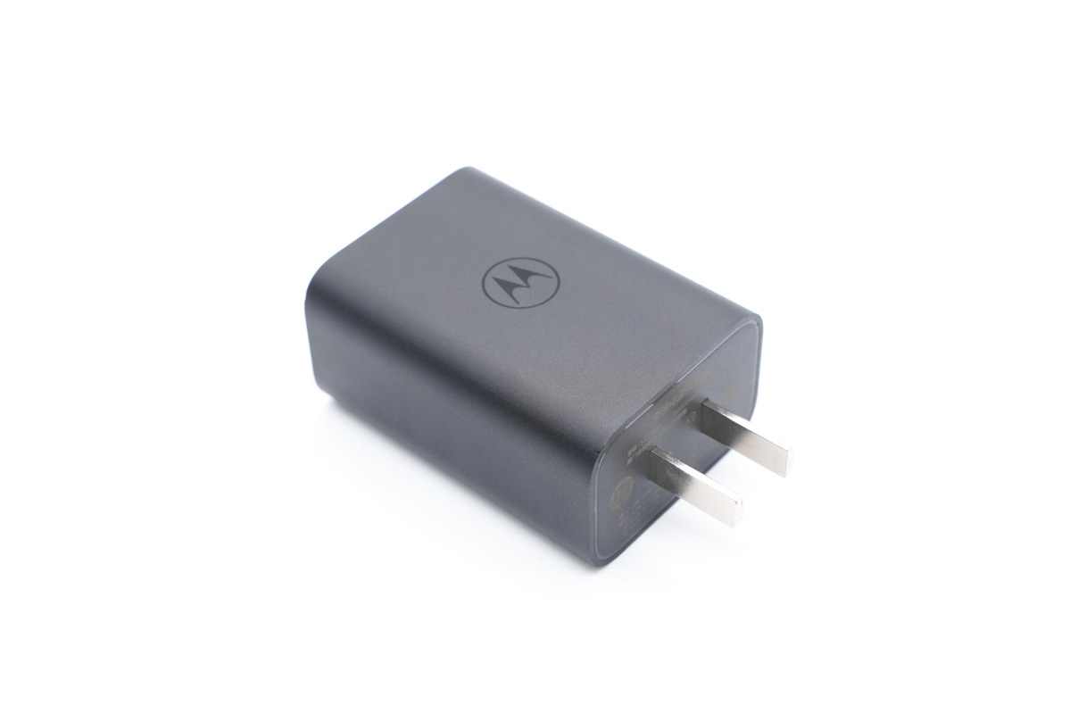 摩托罗拉Edge X30手机标配的这款68W氮化镓充电器采用经典直板造型设计,得益于纳微氮化镓功率芯片NV6134A的使用,即便是在如此传统的造型下充电器三维也仅有58*42*28mm,功率密度高达1.01W/cm³,十分的小巧。