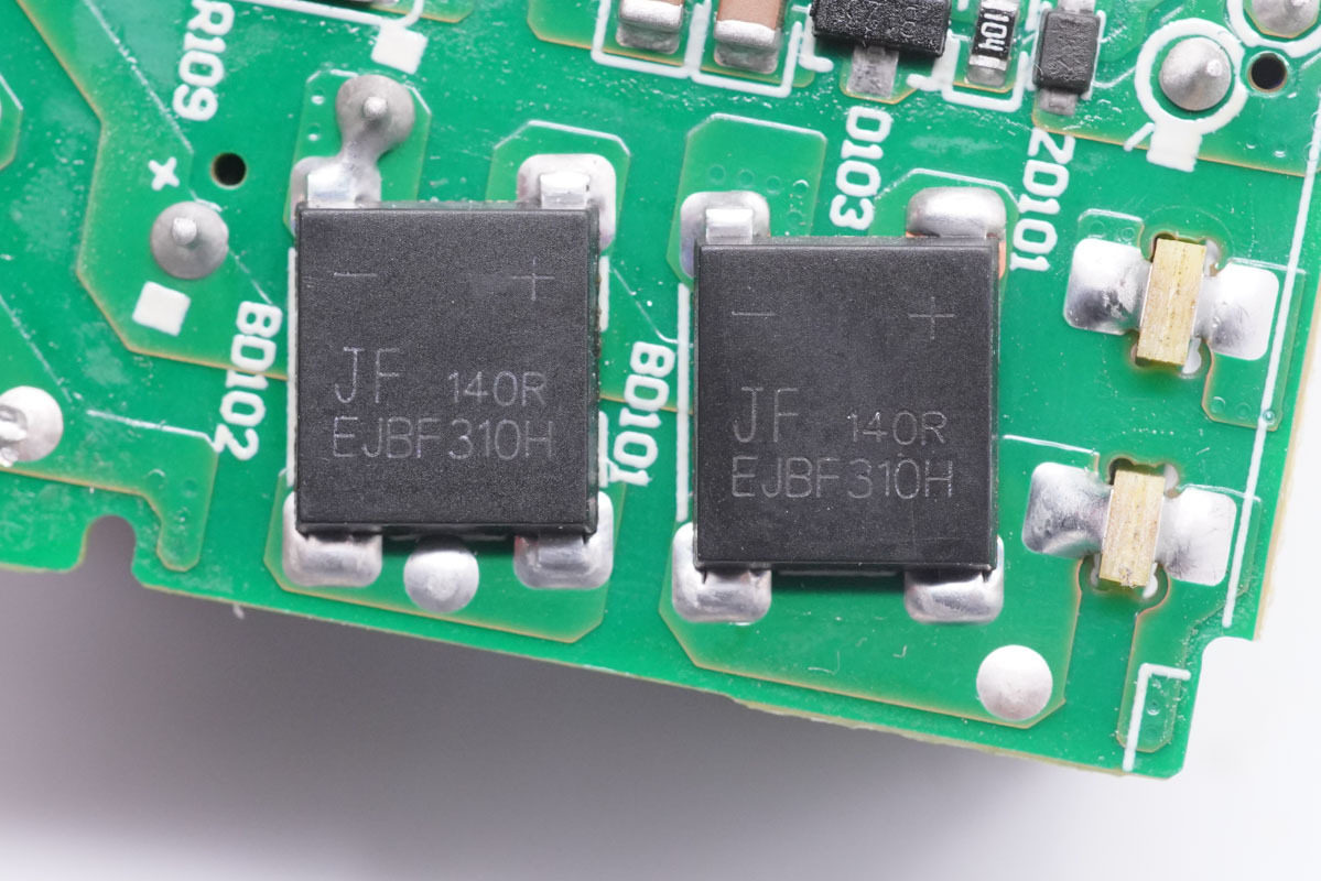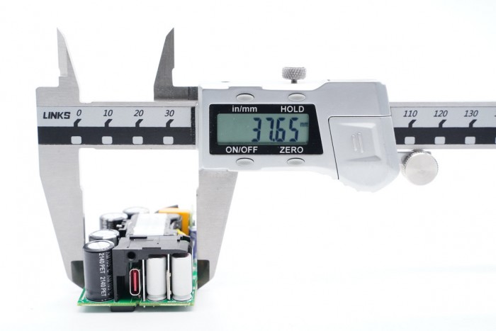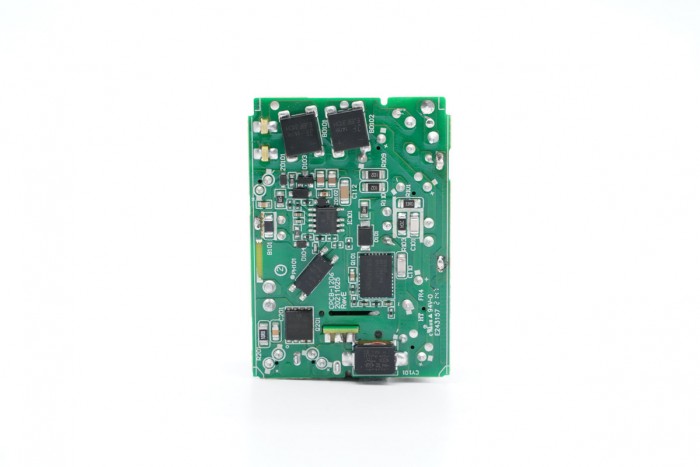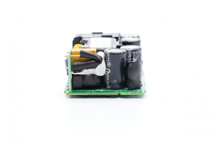 板子背面一览,设有两颗整流桥、开关电源初级PWM控制器、氮化镓功率管、同步整流管、光耦和贴片Y电容。