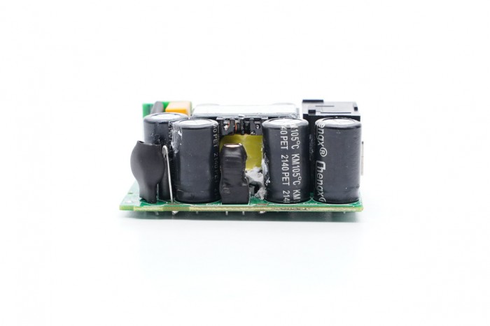 PCB板正面一览,变压器、输出端小板都套有塑料壳进行固定绝缘,电容打胶加固。