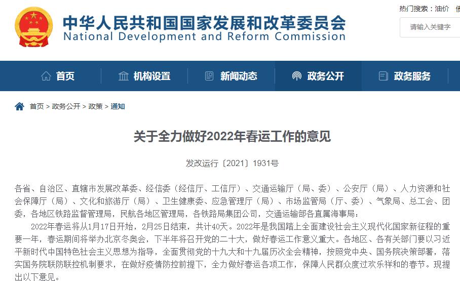 据国家发展和改革委员会网站消息,日前,14部门联合发布《关于全力做好2022年春运工作的意见》。《意见》指出,2022年春运将从1月17日开始,2月25日结束,共计40天。在强化安全有序流动方面,坚决防止“一刀切”和“层层加码”;落实健康码全国“一码通行”,鼓励各地区推广刷身份证自动核验健康码服务。