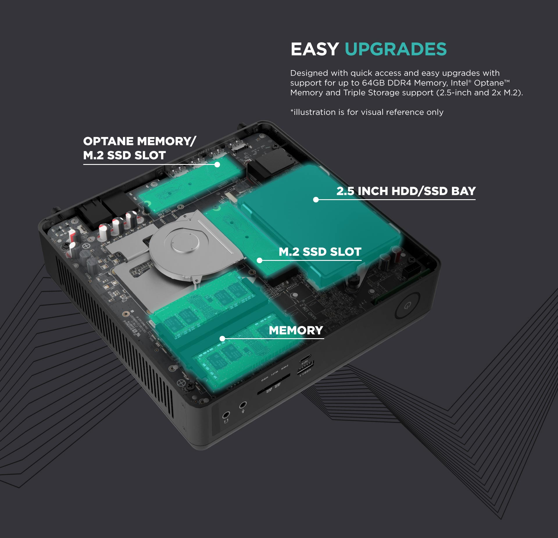存储方面,该机最高可选 64GB DDR4-3200 内存。内置两条 M.2 插槽(其中一条兼容 PCIe / mSATA),另有一个 2.5 英寸 SATA 驱动器位。