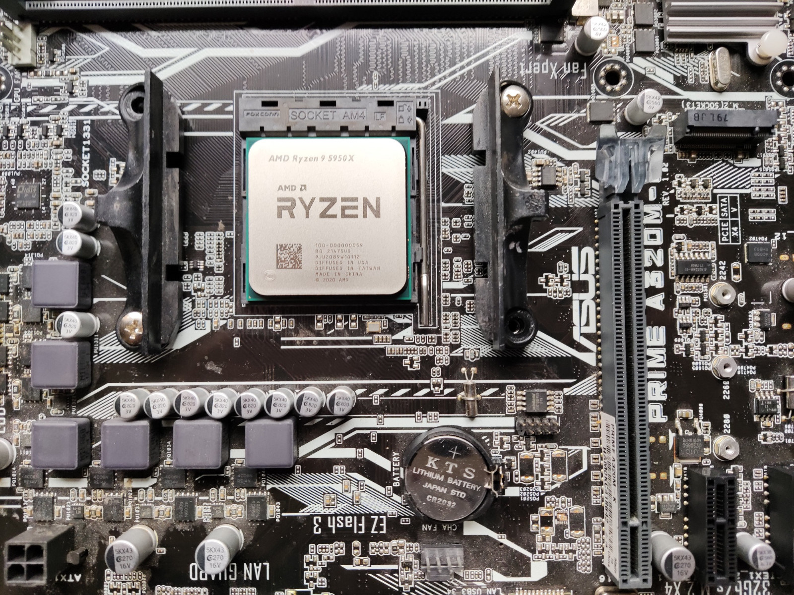 不过 TechEpiphany 的升级旅途也并非一帆风顺,尽管他已经让 R9-3900X(12C / 24T)在 A320 主板上跑了一年,但同为 105W 标称功耗的 R9-5950X(16C / 32T),直到最近才获得了华硕的更新支持。