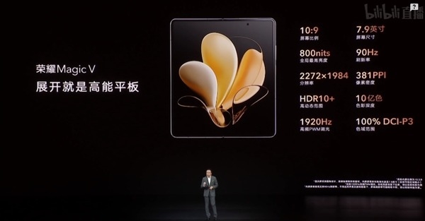 荣耀Magic V这次采用了左右内折的方式,选择了更大尺寸的效果,内部搭载一块7.9英寸超大尺寸屏幕,长宽比为10.3:9,分辨率为2272 x 1984,像素密度达到了381ppi,显示效果细腻。