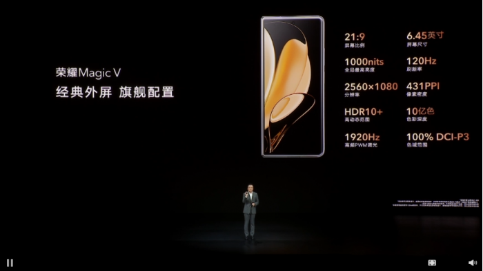 至于外屏方面,荣耀Magic V搭载了一块6.45英寸的OLED屏,比例为21.3:9,分辨率为2560 x 1080,像素密度达到了431ppi,屏占比高达90%,与常规手机类似,可以做到常规手机的显示、操作体验。