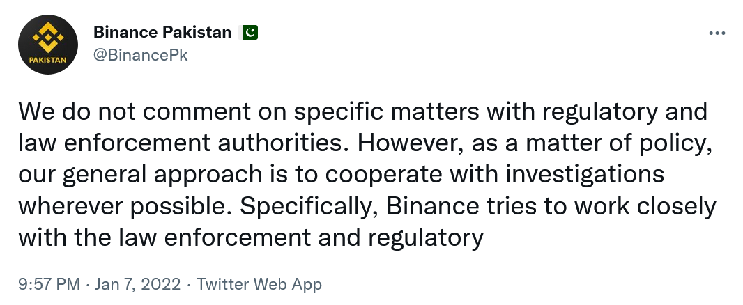 巴基斯坦Binance在Twitter上称,虽然它不对具体的监管事项发表评论,但它的一般做法是合作。“我们不评论与监管和执法当局的具体事项。然而,作为一项政策,我们的一般做法是尽可能配合调查。具体来说,Binance会试图跟执法和监管部门密切合作。”