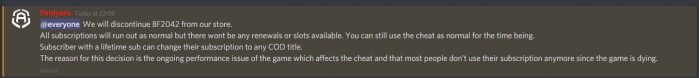 有趣的是,根据先前爆料DICE开发时长过短的Tom Henderson今日发推特称,有外挂开发商在Discord通知开挂玩家,将停止更新《战地042》的外挂,其理由并不是反外挂程序的影响,而是因为游戏本身诸多的性能问题影响到了外挂程序的运作。同时,对话截图中该外挂开发商甚至还建议使用外挂的玩家转战《使命召唤》。