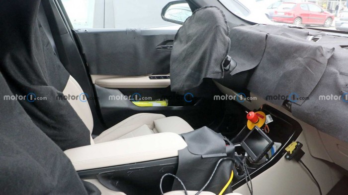 由于前车门上并未有伪装,所以我们能简单看到宝马iX1的前排车内布局,在方向盘后方的伪装盖布之下,似乎有一个联屏设计,而中央空调出风口似乎被放在了中控显示屏的上方。而在中央扶手箱前方,是一个延伸出来的平台,应该会放置换挡机构和驾驶模式调节的物理按键。而在换挡机构前方,则是一个开阔的空间,应该会有杯架、无线充电槽等配置。不过值得注意的是,测试车前排座椅之间并没有“掏空”成为一个大型储物槽,这点或许会影响宝马iX1在同级别市场中的竞争力。
