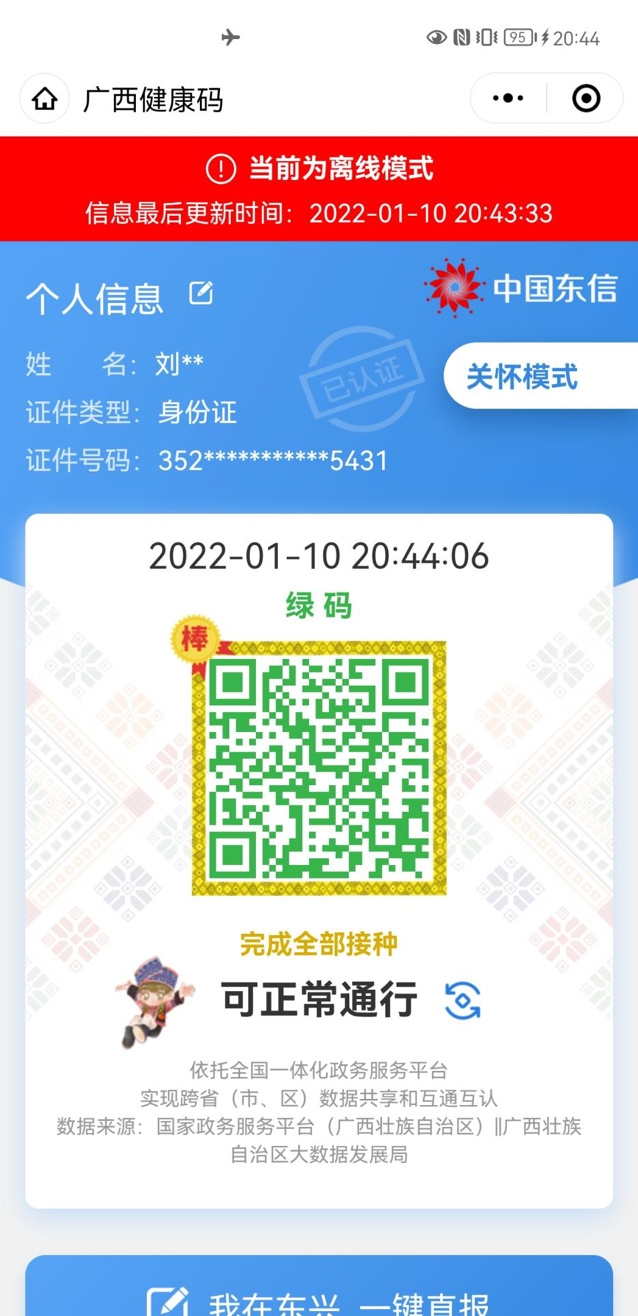 据悉,广西健康码“断网可用”功能在运营商通信网络服务中断、附近区域无移动信号、健康码崩溃、健康码无法正常响应等紧急状态下,广西健康码小程序(“扫码抗疫情”小程序)系统会自动跳转到“当前为离线模式”,展示群众最新的广西健康码状态信息。