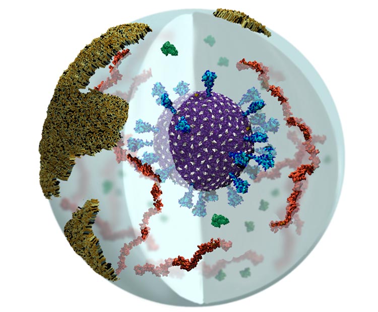 这些模拟包括病毒膜的更复杂的细节以及气溶胶的可视化。除了SARS-CoV-2病毒之外,这些亚微米级的呼吸道气溶胶还含有粘蛋白、肺表面活性剂、水和离子。