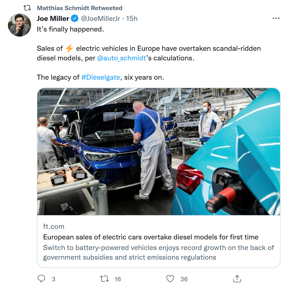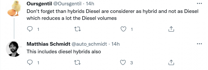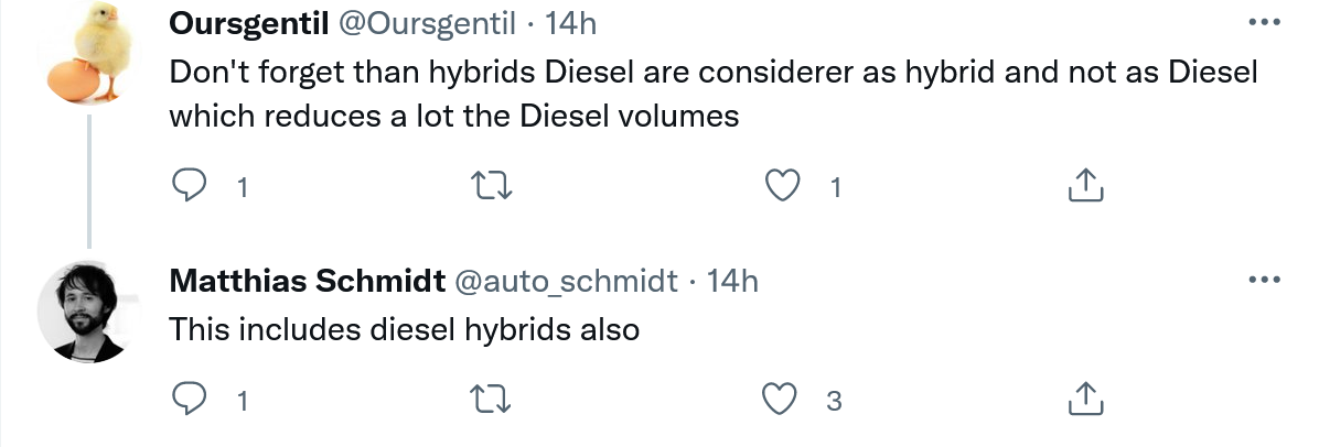 欧洲汽车制造商因在供应链危机期间优先生产利润较高的车型(主要是污染严重的suv)而被欧盟的罚款。为了避免此问题再次出现并减少了汽车总体二氧化碳排放量,欧洲国家在12月进一步促进电动汽车的销售。当月西欧售出了17.6万辆电动汽车,达到历史新高,销量比2020年12月的高出6%。相比之下,上个月柴油车销量约为16万辆。