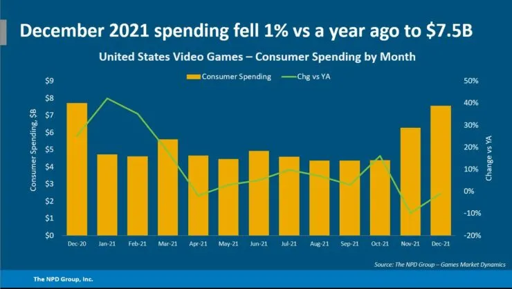 NPD集团最新报告的第二个亮点是,尽管与一年前相比,消费者在视频游戏硬件、内容和配件方面的支出下降了 1%,但 2021 年消费者总支出达到了 604 亿美元的记录,比去年的记录高 8%。这个数字包括所有内容类别的收入(包括完整的游戏,后续,以及在游戏主机,云,移动*,便携式,PC 和 VR 平台的订阅支出),硬件,和配件。