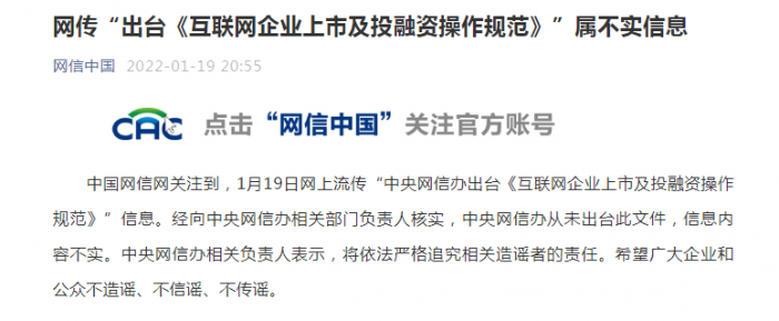 1月19日网上流传“中央网信办出台《互联网企业上市及投融资操作规范》”信息。经向中央网信办相关部门负责人核实,中央网信办从未出台此文件,信息内容不实。