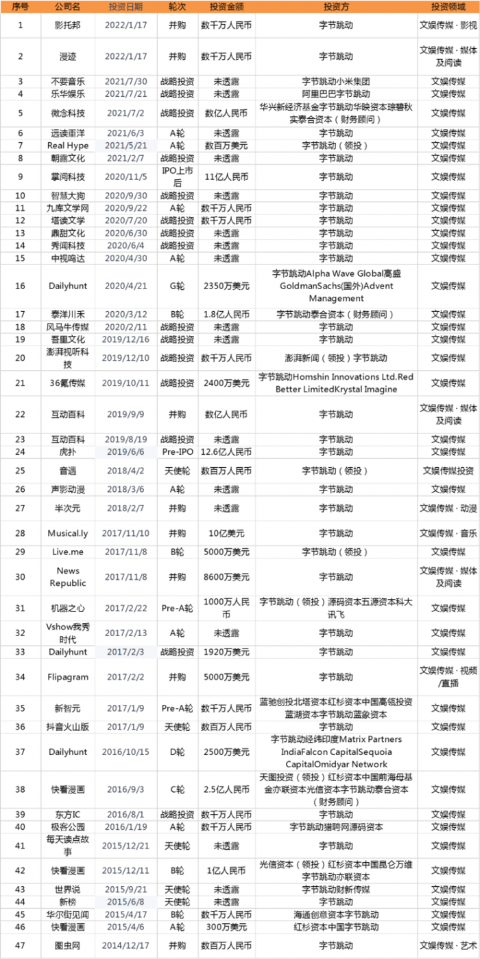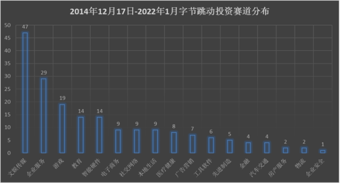 据 IT 桔子数据及雷峰网不完全统计,自 2014 年 12 月 17 日至 2022 年 1 月 18 日,字节跳动一共产生了 189 笔对外投资。主要涉及在文娱传媒、企业服务、游戏、教育、智能硬件、电子商务、社交网络、本地生活、医疗健康等 17 个细分领域。