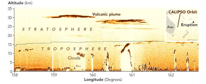 第二张图片--基于云雾雷达和红外探路者卫星观测(CALIPSO)任务在1月16日收集的数据--显示了喷发的灰烬和气体上升到31公里(19英里)的高度。CALIPSO是NASA和法国国家空间研究中心(CNES)的一项联合任务。