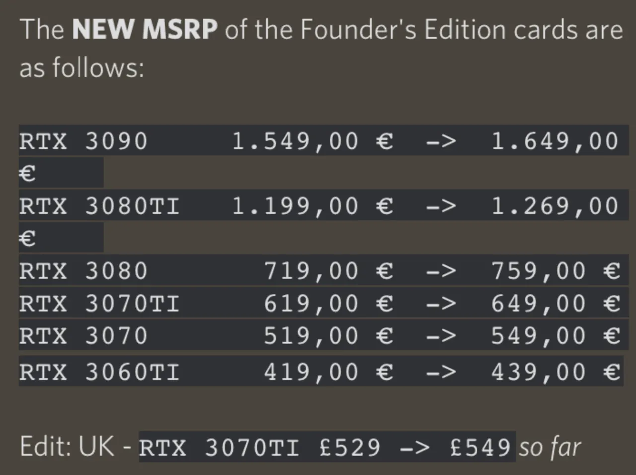 伴随着加密货币价值的下降,以及 1 月份显卡的供应情况好转,NVIDIA 决定是时候提高其公版价格了。到目前为止,这个新的定价只影响到在欧盟销售的 Founders Edition 型号,但有消息称该公司也将在英国提高价格。