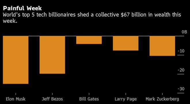 除了阿尔诺,马斯克、贝索斯、盖茨、佩奇以及扎克伯格的净资产总共损失了670亿美元。