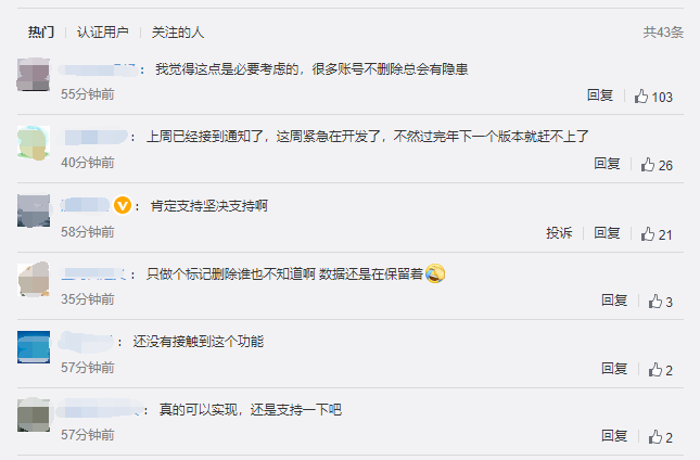 在这条热搜的相关微博中,大部分网友都在留言区表示强烈支持,有网友表示:“我觉得这点是必要考虑的,很多账号不删除总会有隐患”“强烈支持,一键删除 ”。