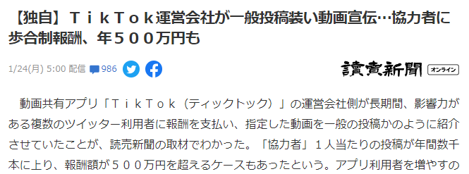 1月24日今天据外媒《读卖新闻》独家报道,曝出目前短视频界的霸主TikTok在国外推广时使用的手段,暗地里塞钱给大量推特网红,将指定的TikTok系视频伪装成普通视频发布,而发的越多提成越高,有发布上千条的推主年收高达近5万美元。
