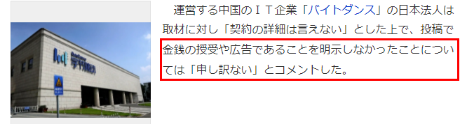 •内幕被揭发后,有日本媒体向TikTok日本咨询此事时,公司则回应称“合同的详细内容无可奉告”,对于没有公示背后的金钱交易以及广告事项则表示“非常抱歉”。