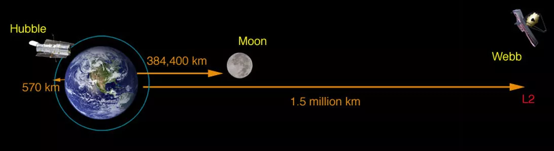 太阳和地球共享五个这样的拉格朗日点,它们散布在地球的周围。JWST围绕着名为L2的拉格朗日点运行,它距离太阳更远。在这个位置,当地球绕着恒星运行时,JWST将几乎同步地跟随着这颗行星,就像一个恒定的伴侣,总是在与地球相对的同一位置上。无论地球围绕太阳运行在哪里,JWST都保证距离我们大约160万公里。