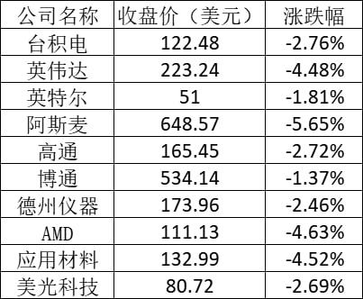 芯片龙头股普遍下跌,英伟达、AMD和应用材料跌幅超过4%,台积电和高通跌幅超过2%。