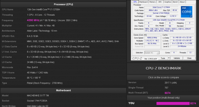 另外,刚才提到的i7-12700H已经出现在CPU-Z认证数据库,但是只认出6个大核心,未显示8个小核心,各级缓存倒是正确的,而频率方面大小核最高分别为4.7GHz、3.5GHz。