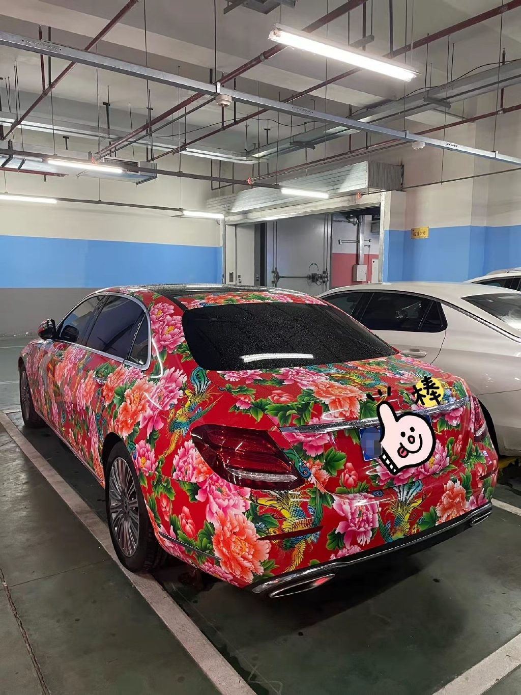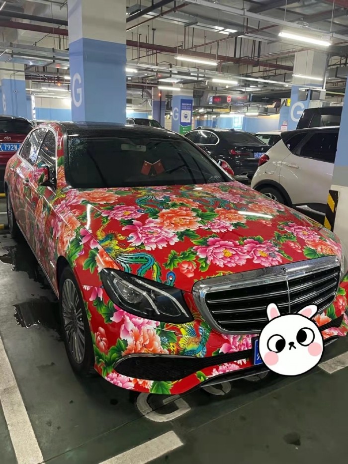 据拍摄的图片显示,这台奔驰E级贴上了非常花哨的贴膜,贴膜上面花花绿绿,印着大朵大朵的牡丹花、凤凰等元素图案,跟老式的床单、大棉袄等保持了高度一致。