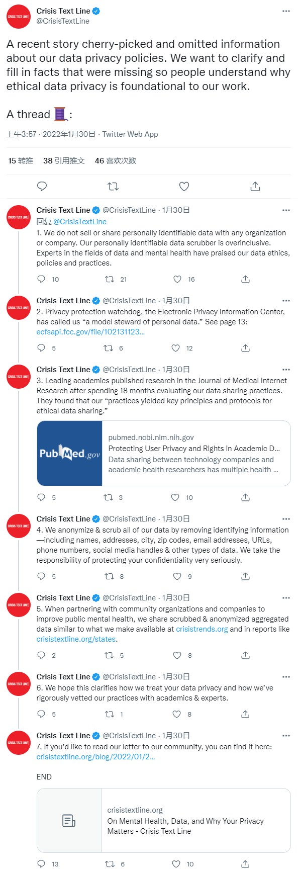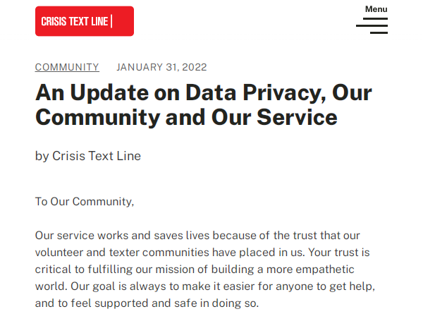 有鉴于此,双方将终结现有的合作关系,且 Loris.ai 会删除它从 Crisis Text Line 获取的任何数据。