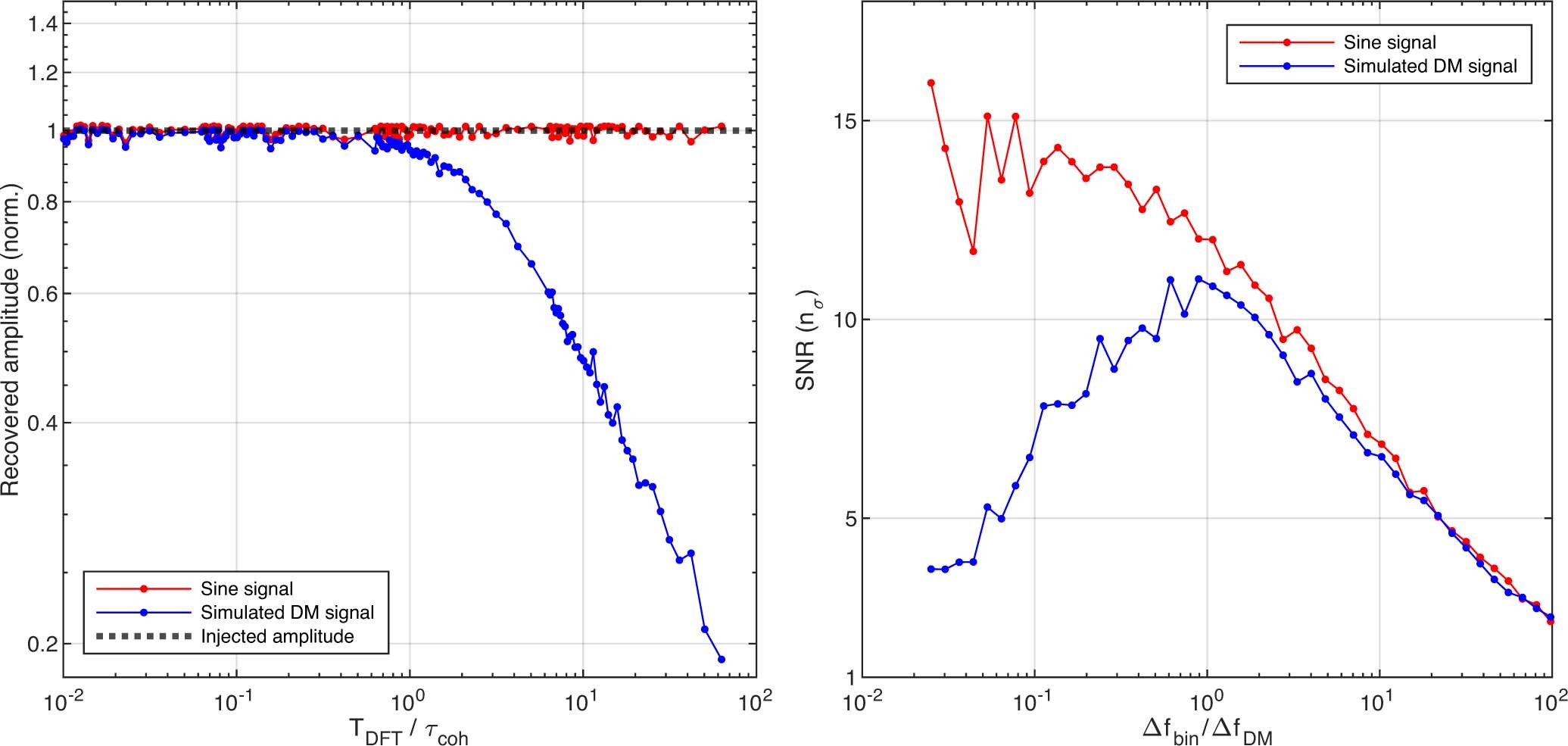 扩展数据 - 图 1:模拟暗物质信号和单色正弦波的光谱幅度和 SNR