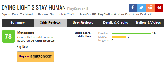 距离《消逝的光芒2》发售接近1天的时间了,目前媒体对该作的评分也已经解禁。截止发稿时,M站有26家媒体对该作进行了评测,其中19家好评,7家中评,均分78。