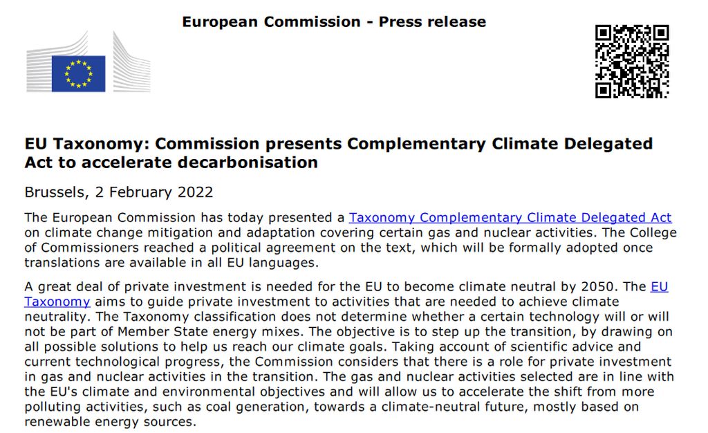这些新要求代表了根据欧盟分类法对核能和天然气进行分类的努力,该分类法是为投资者制定的一套准则,旨在通过定义什么是可持续发展来"防止洗绿"。