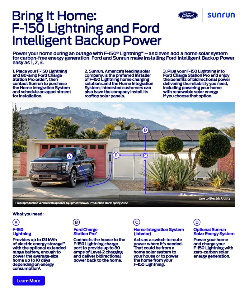 福特已经选择硅谷太阳能供应商Sunrun作为其首选的智能备用电源安装商。F-150 Lightning 增强里程版本的买家将自动收到 80 安培的 Ford Charge Station Pro,而标准里程版本的买家可以单独购买。当与Sunrun公司合作开发的家庭集成系统相结合时,该套件增加了双向电力流所需的电源逆变器、暗启动电池和转换开关。