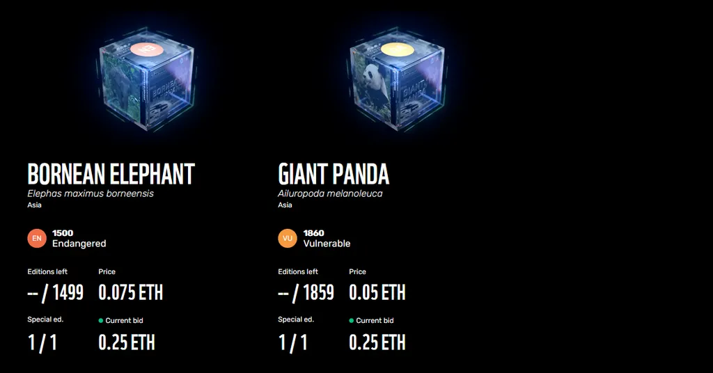 世界野生动物基金会英国分会本周推出了 NFA,即称之为“nonfungible animals”(非同质化动物)的 NFT 作品。该数字作品以 13 种濒危动物为中心,每种 NFA 都仅限于该物种的现存数量。