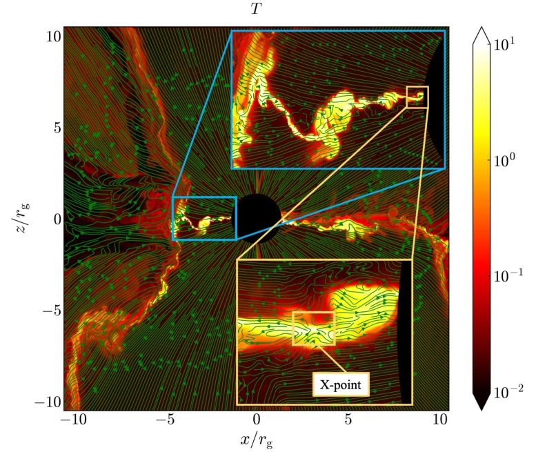 通过采用功率和分辨率都无与伦比的计算机模拟,物理学家说他们已经解开了这个谜团。研究人员在《天体物理学报》上报告说,在黑洞的事件视界附近,磁场线重新连接时释放的能量为耀斑提供了动力。