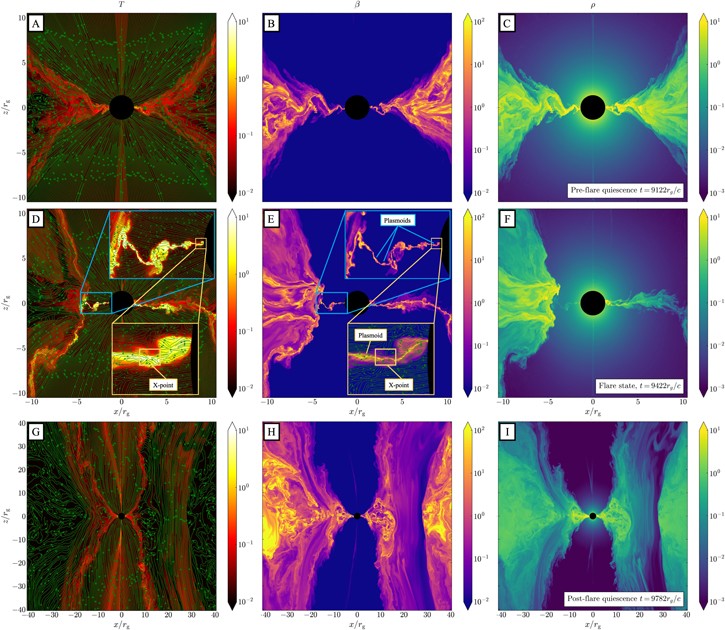 分辨率的提高使研究人员对导致黑洞耀斑的机制有了一个前所未有的了解。这个过程以黑洞的磁场为中心,它的磁场线从黑洞的事件视界涌出,形成喷流并连接到吸积盘。以前的模拟显示,流入黑洞赤道的物质将磁场线拖向事件视界。被拖动的磁场线在事件视界附近开始堆积,最终推回并阻挡流入的物质。