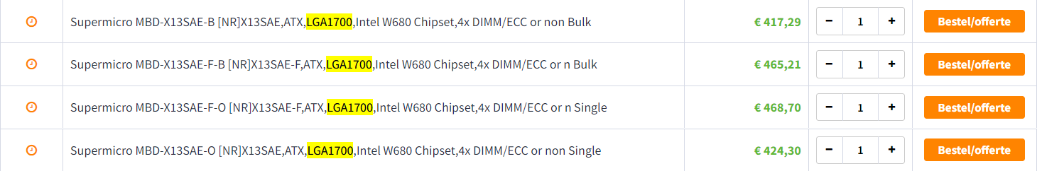 作为即将推出的 Alder Lake 架构主流至强(Xeon)处理器的搭档,包括 Sona & Ahead-IT 在内的欧洲零售商,已经曝光了首批 W680 芯片组主板的售价和更多细节。由 @Momomo_US 在推特上分享的截图可知,超微(SuperMicro)有提供 Bulk / Single-Unit 的选项。