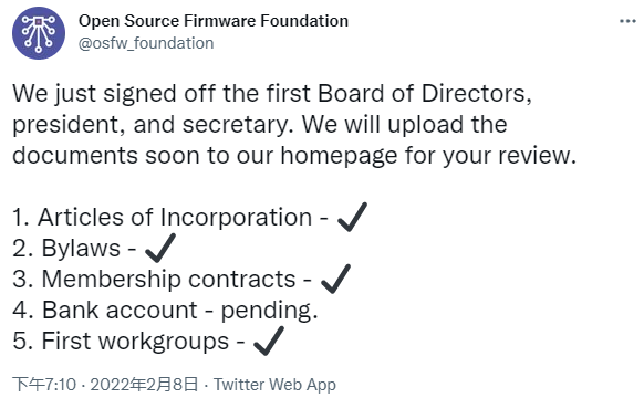 osfw.foundation 网站写道:该基金会的总体目标,是加强开源固件领域里各个相关方面之间的沟通。