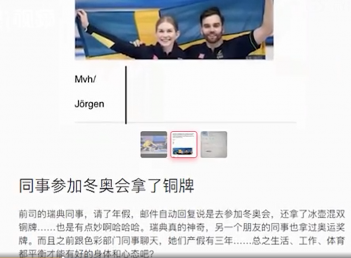 今日,一则上海男子发现同事请假参加冬奥会顺手获得铜牌的消息登上微博热搜。据@021视频 报道,近日,上海一名员工发现,自己的同事请假去参加冬奥会了。阿克苏诺贝尔中国分公司相关负责人表示,25岁的阿尔米达·德瓦尔是瑞典公司的员工,一月初请假备战冬奥,并获冰壶混双第三名。