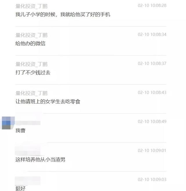 望子成龙,盼女成凤。天下父母,似乎没有不希望儿女有出息的,至少也要做一个正直的人。但是,知名量化投资人丁鹏的想法有点不一样。一份网传的聊天记录显示,丁鹏公然称“不培养儿子,不要求发财,让他去渣,多找几个女人,给老爸多生几个孙子”。